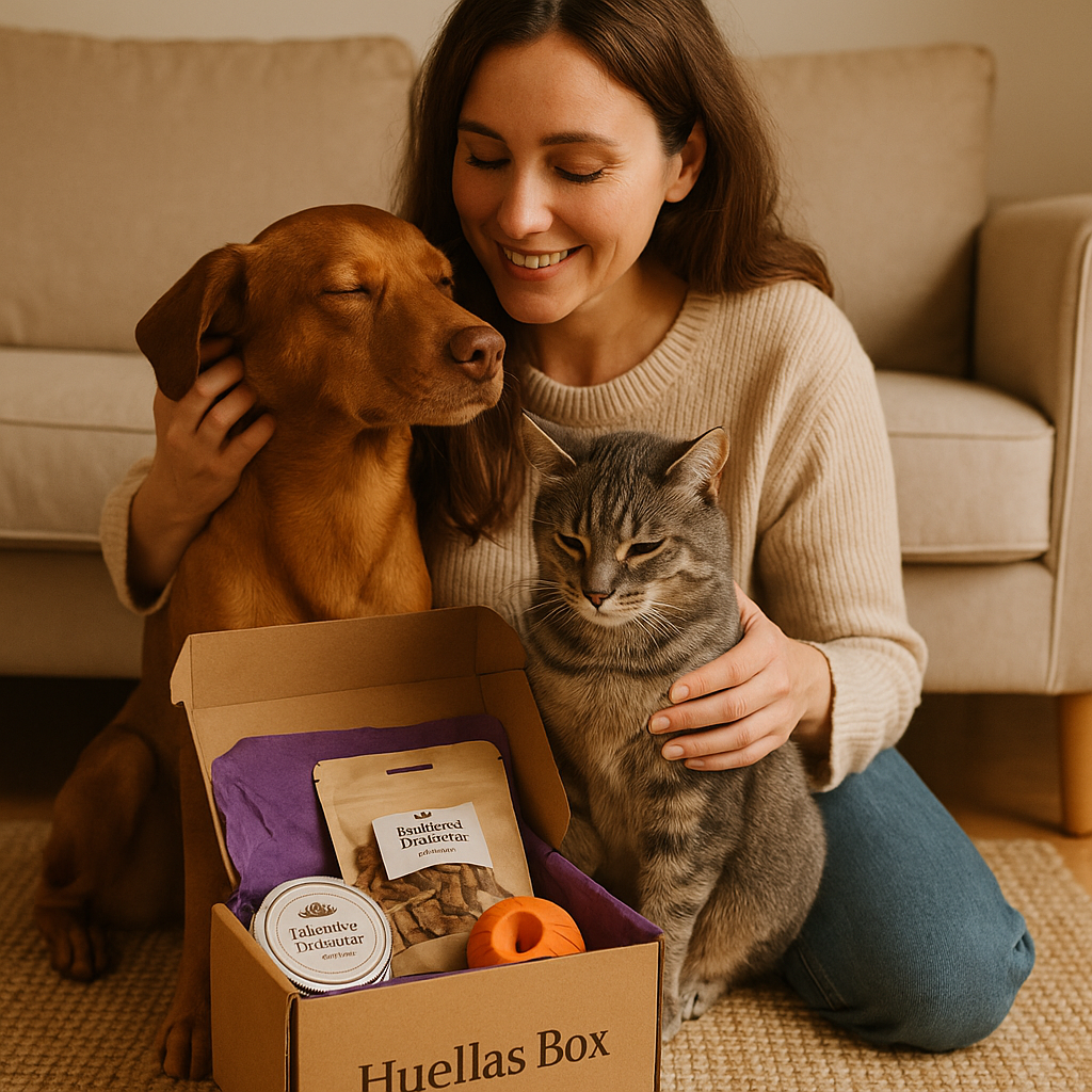 Huellas box nació del deseo de ofrecer bienestar, ilusión y productos naturales pensados para peludos únicos y para quienes los queremos tanto.